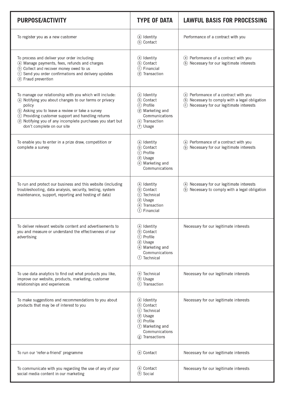 We have set out in a table at the end of this document, a description of all the ways we plan to use your personal data, and the legal basis we rely on to do so. In brief, we use your data: