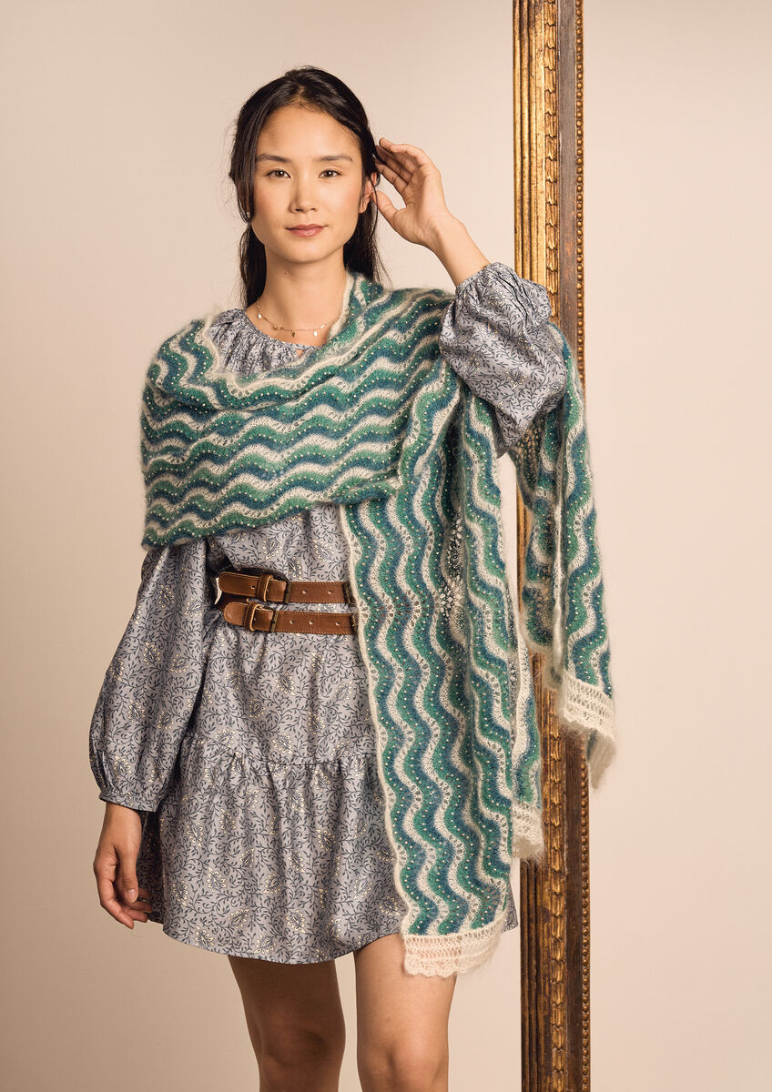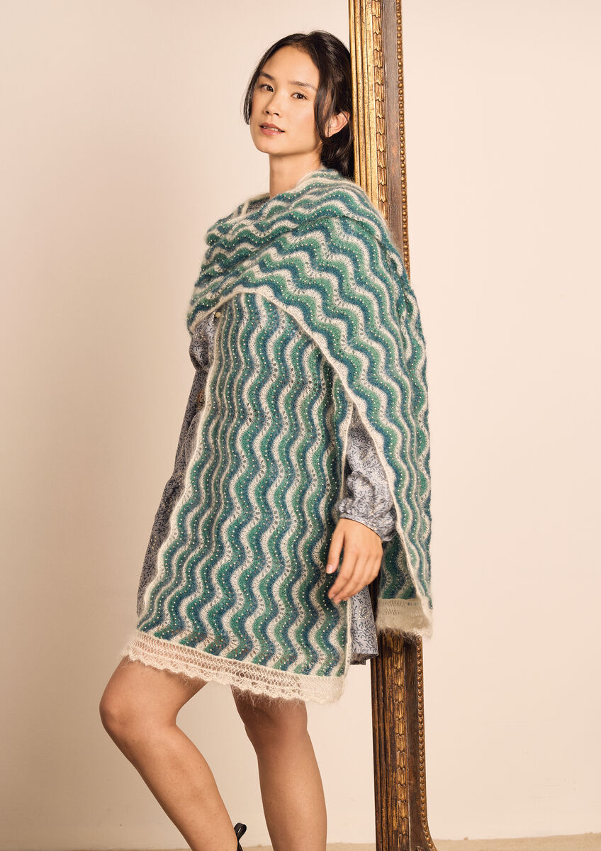 Lisa Richardson has used three shades of Kidsilk Haze to create this beautiful, beaded scarf. Knitted lengthways allowing the lace stripes to really shine, this rhythmic pattern is a joy to both knit and wear. A contrasting lace border is the perfect finishing touch for this eye-catching accessory.