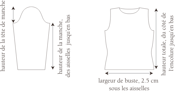 Dans les explications des modèles, le premier nombre, celui qui est avant les parenthèses, concerne la plus petite taille, ceux entre parenthèses concernent les autres tailles dans un ordre croissant. S’il n’y a qu’un nombre, il s’applique à toutes les tailles. La plupart des modèles contient un schéma qui représente le vêtement terminé et en donne les dimensions principales – voir le schéma ci-contre. La mesure indiquée en bas est celle de la largeur du vêtement, 2.5 cm sous le début des emmanchures.