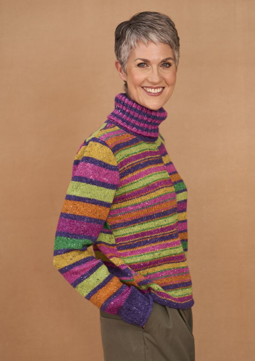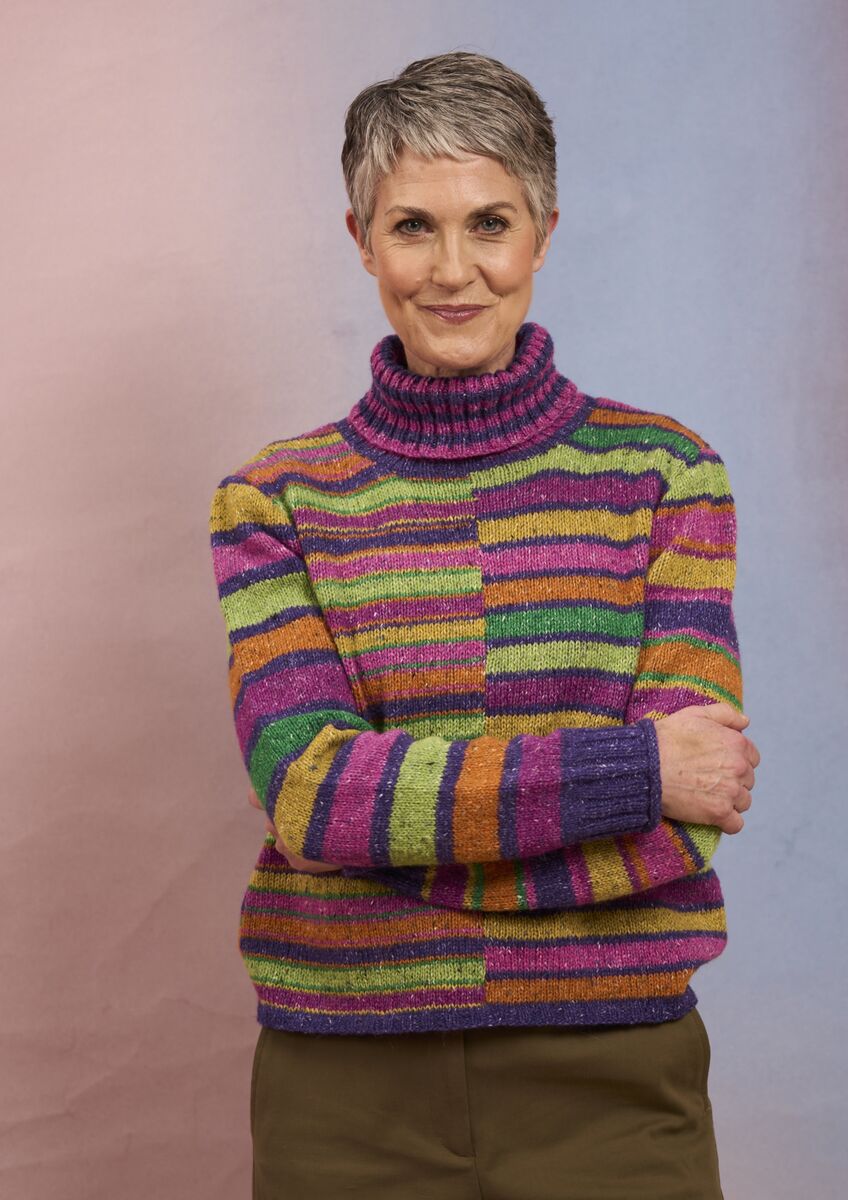 This striking sweater from Kaffe Fassett features a beautiful palette of seven shades of Felted Tweed. Stripes of differing heights are worked all over this colourful knit, including a clever juxtaposition of the striped pattern at the front. A two-colour ribbed roll neck is the perfect finishing touch to this stylish knit.